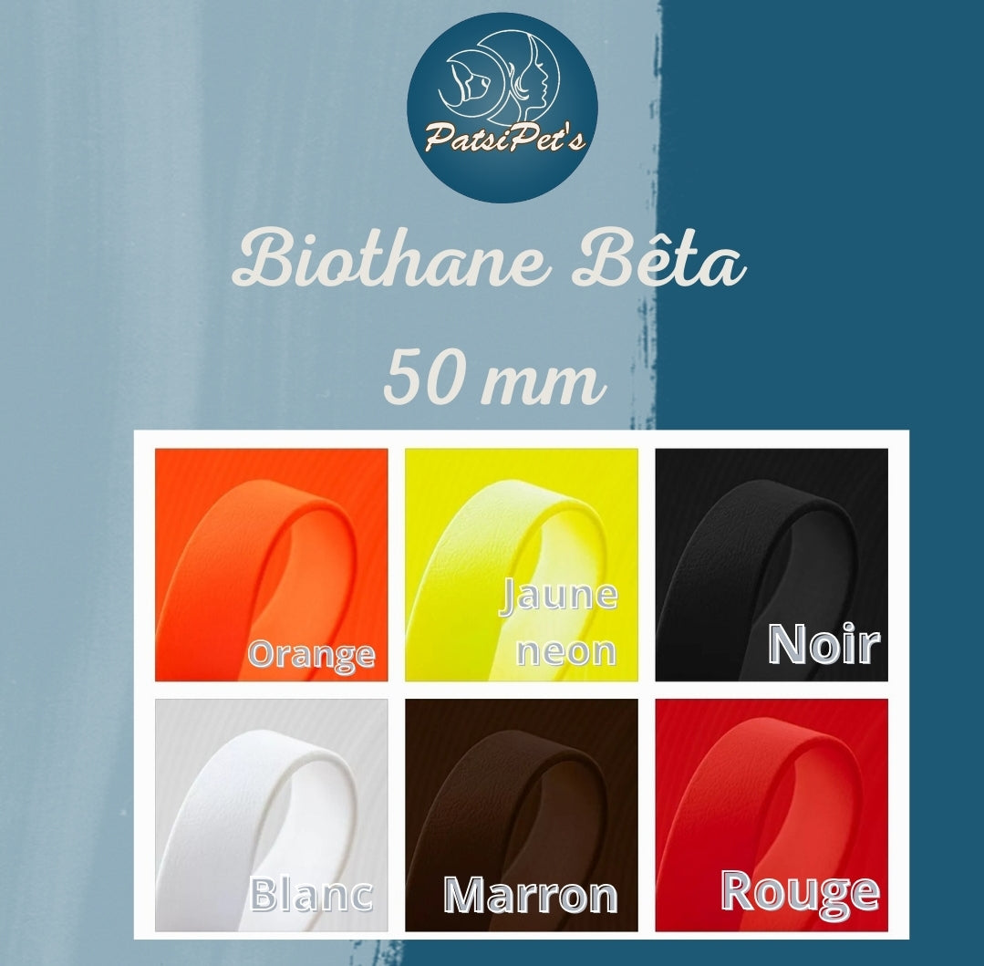 Le Biothane est une matière synthétique de haute qualité. Plus résistante que le cuir avec une grande résistance aux coupures et abrasions , bonne résistance globale aux produits chimiques et une excellente flexibilité à basse température. Facile d'entretien et waterproof.