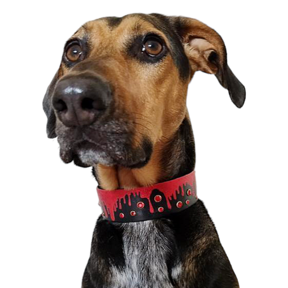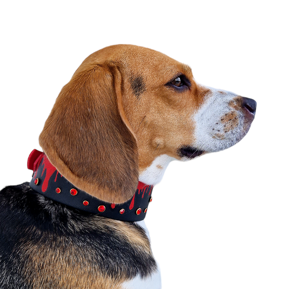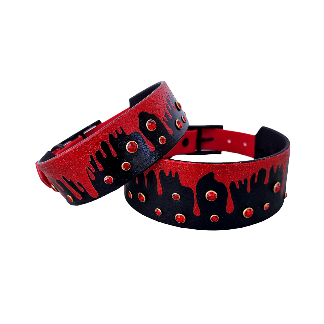 Plongez dans l'univers envoûtant d'Halloween avec nos colliers pour chiens en biothane, conçus pour ajouter une touche de magie sombre à la garde-robe de votre fidèle compagnon à quatre pattes. Nos colliers sont recouverts d'une peinture rouge pailletée qui évoque le sang qui coule, et ornés de strass rouges étincelants pour un look à la fois élégant et effrayant. Chaque collier est soigneusement fabriqué à la main avec un souci du détail, garantissant une qualité exceptionnelle et un confort optimal pour votre chien.